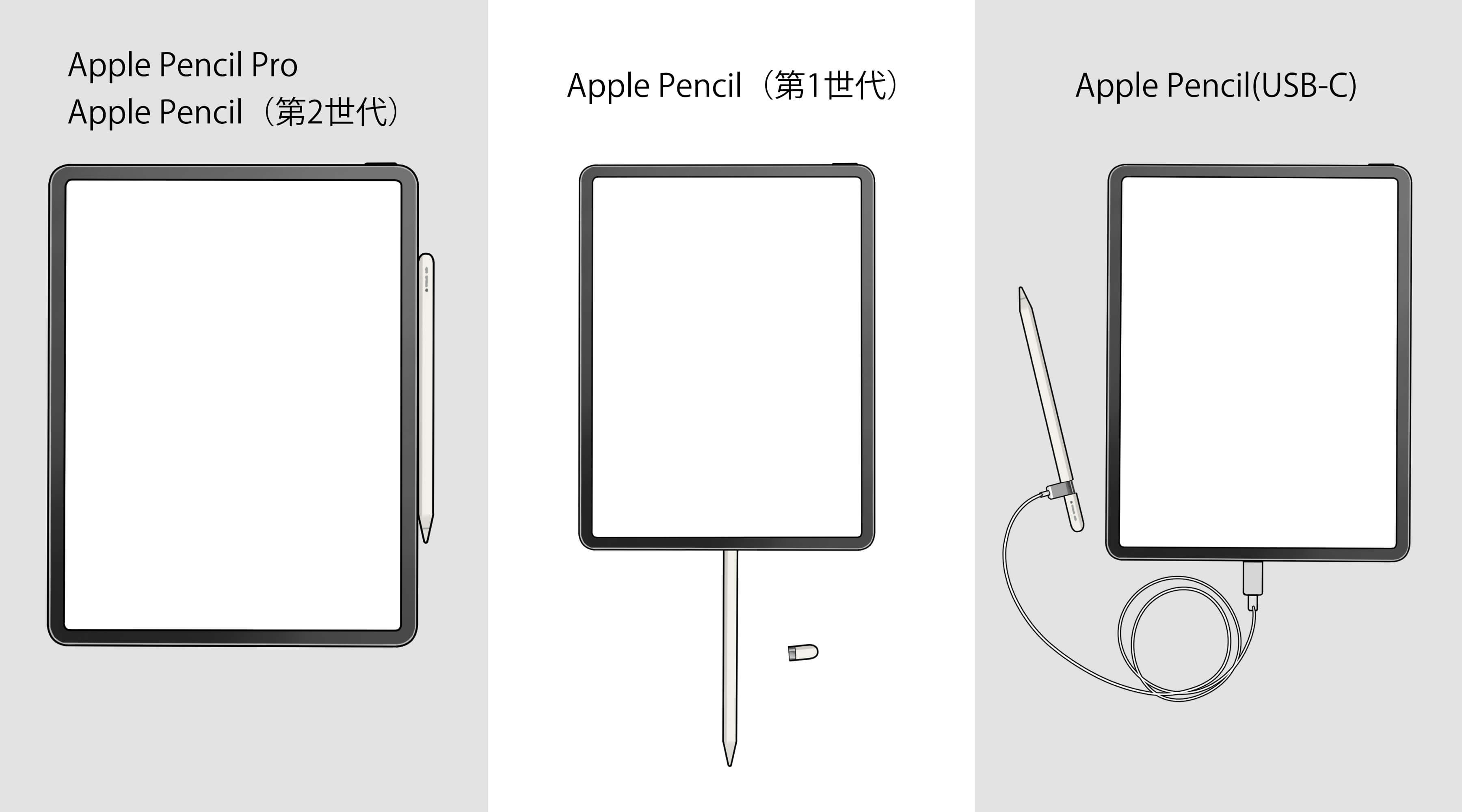 Apple Pencilには「第1世代」、「第2世代」、「USB-C」、そして「Pro」の4種類があり、iPadのモデルによって使えるApple Pencilも異なります。