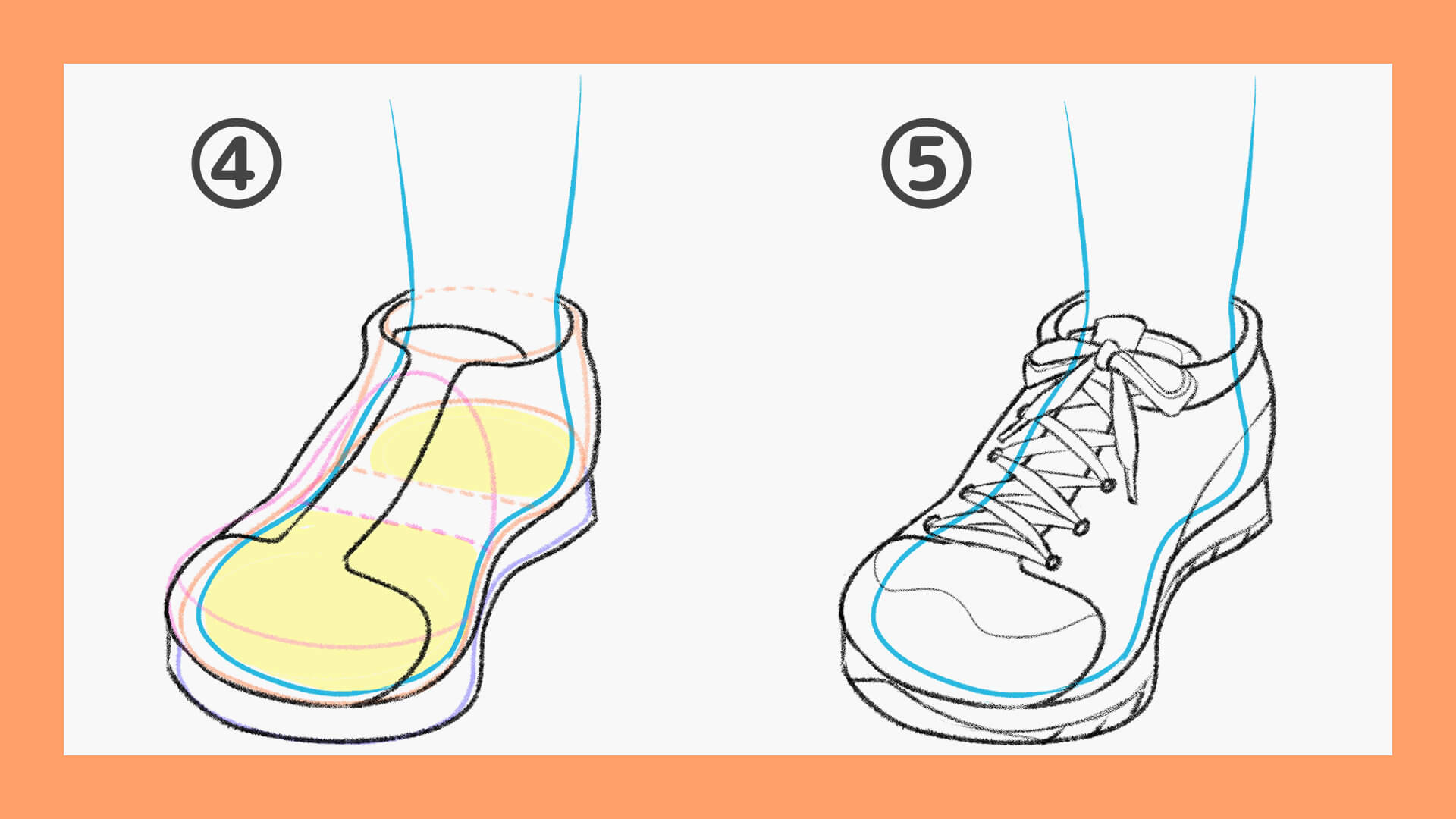 足の素体と靴がぴったり重なるように描くのではなく、足を包むように大きめに描きましょう。