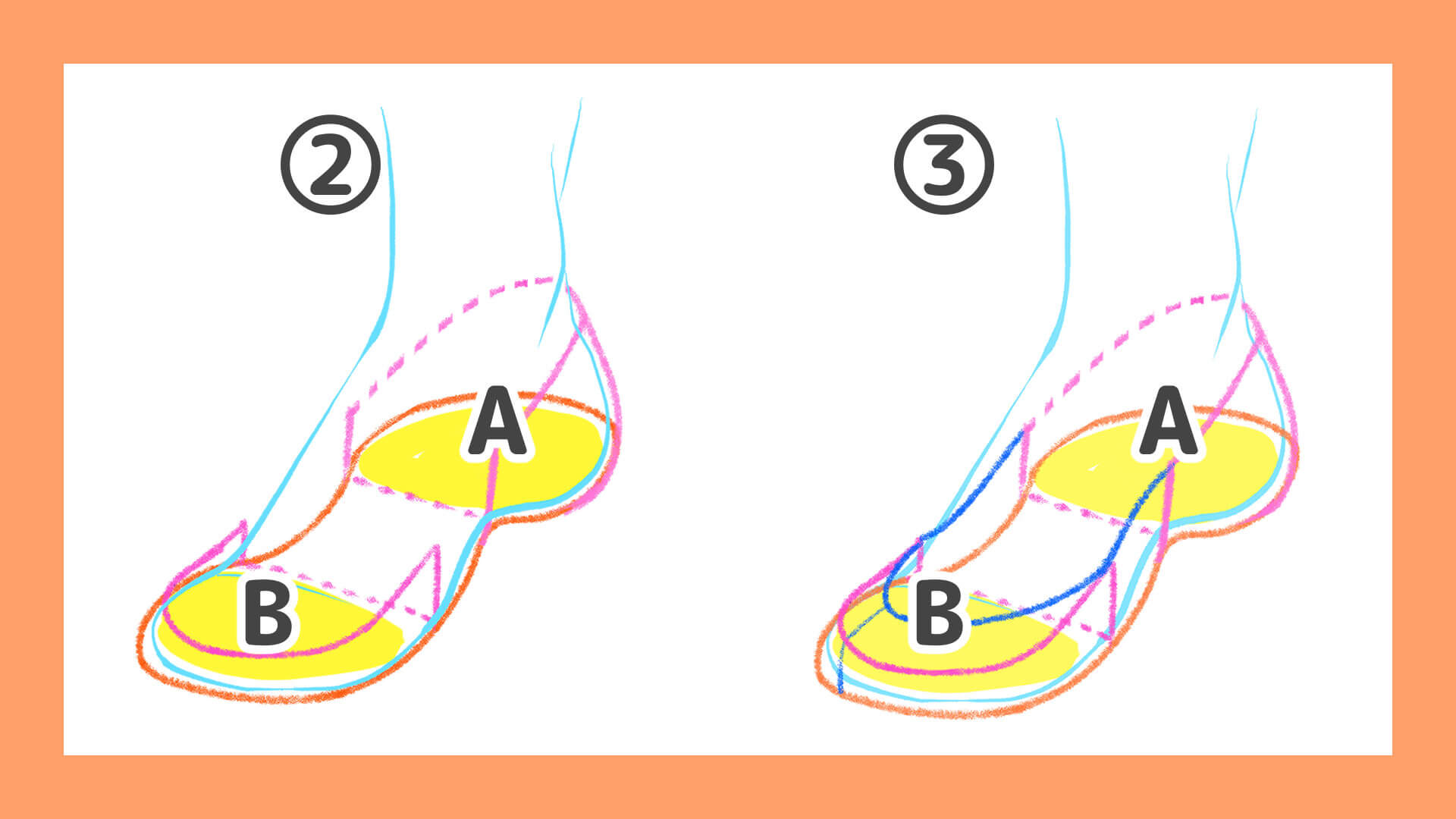 ③Aのかかと、Bのつま先の線を繋げて履き口を描きます。