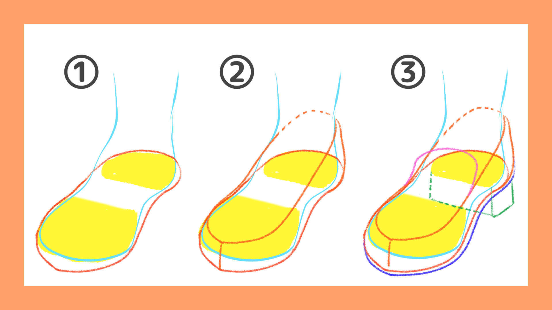 ソールと地面の接地面を描いて、靴の角度をイメージします。