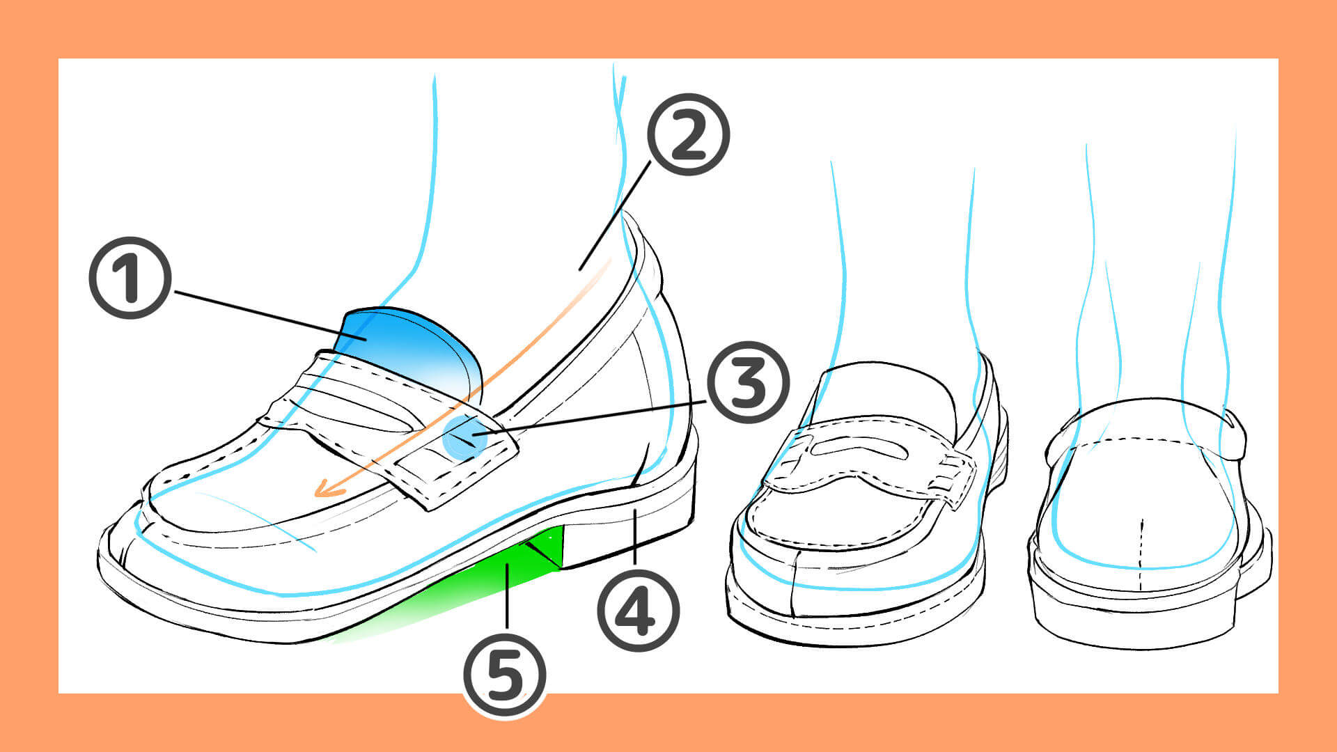 ⑤ヒールの高さがあるため、地面と靴底の間に空間を作ります。
