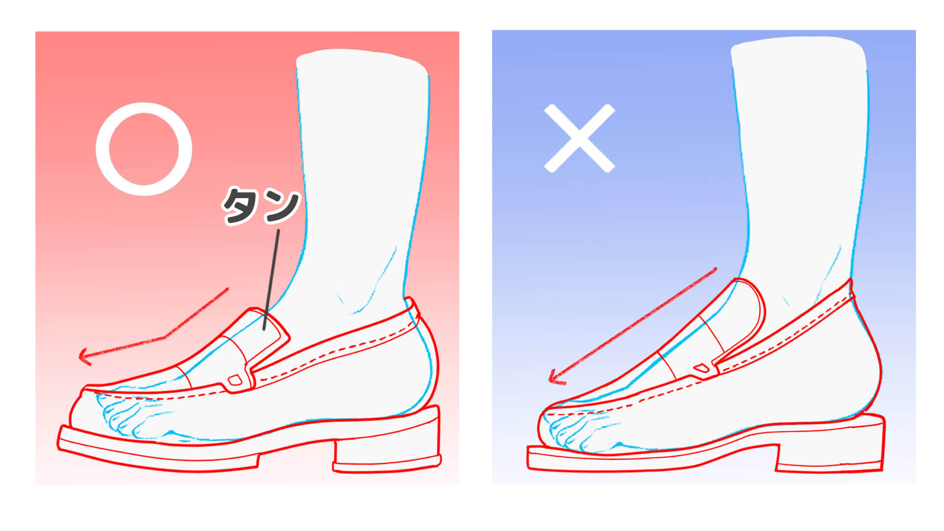 くるぶしや指の付け根~足の甲までの可動域に、靴のかかとやタンが当たらないようにしましょう。