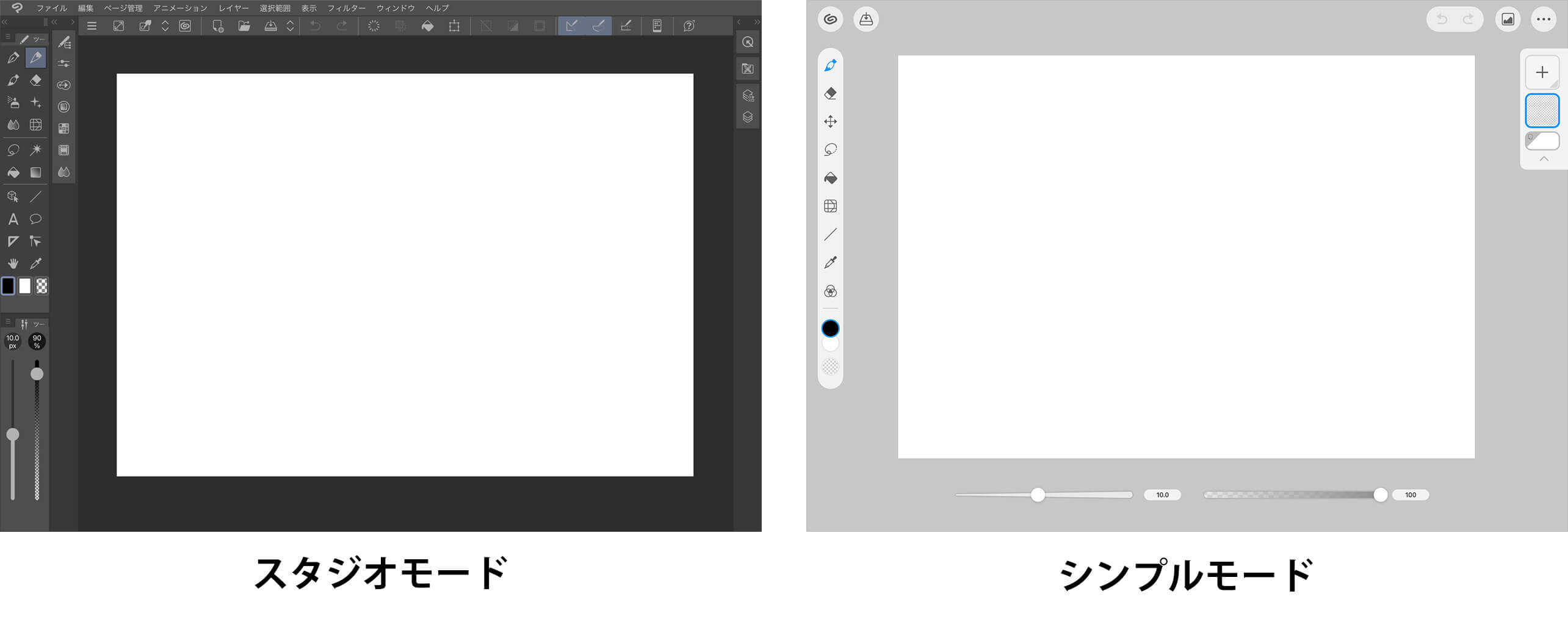 タブレット版のCLIP STUDIO PAINTでは、スタジオモードとシンプルモードの2つのインターフェースがあります。
