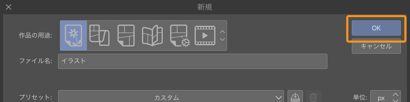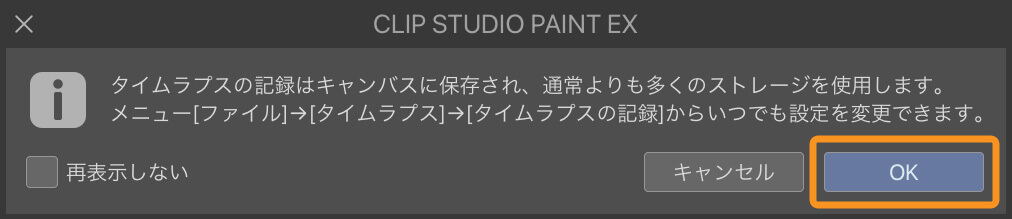 最後に、[新規]ダイアログの右上にある[OK]ボタンを押せば、タイムラプスが記録されている状態のキャンバスが作成できます!