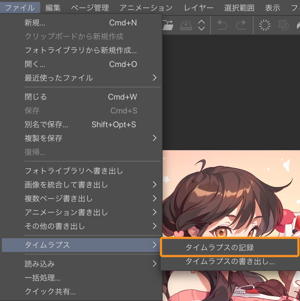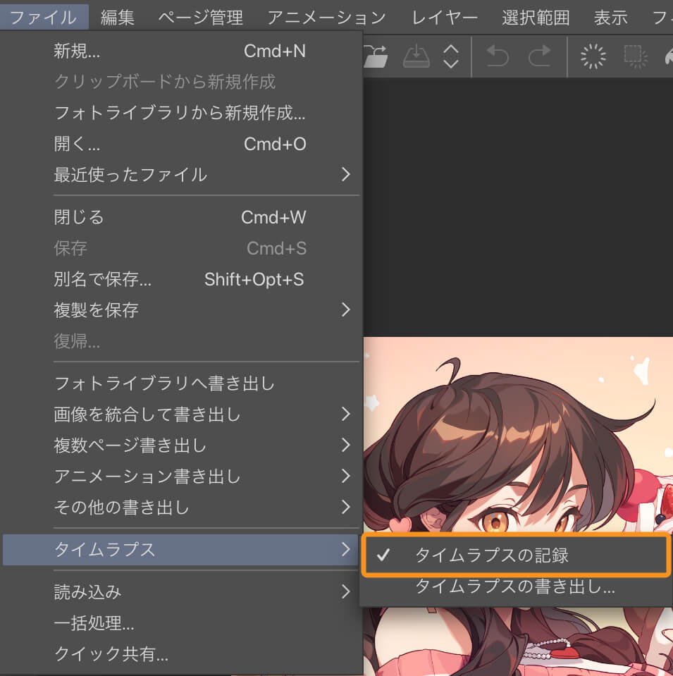 描いている作品を開いた状態で、[ファイル]メニュー→[タイムラプス]→[タイムラプスの記録]をチェックします。