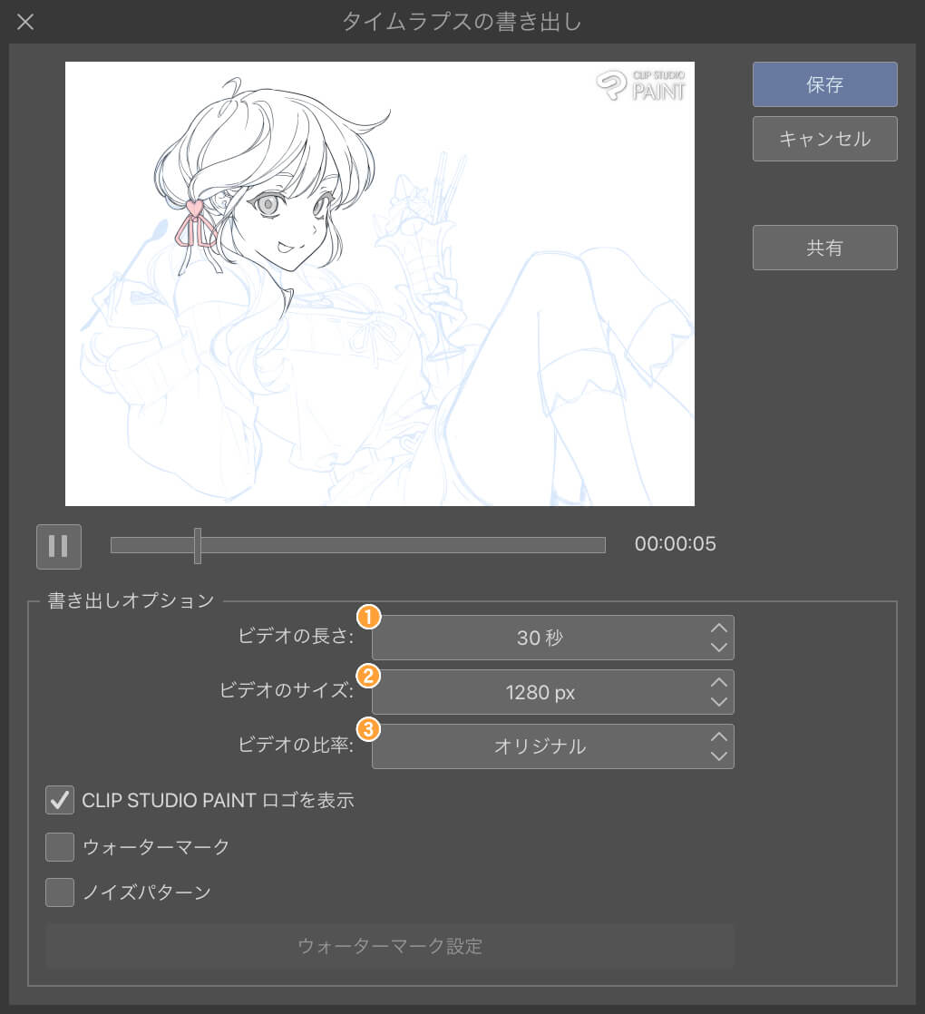 [タイムラプスの書き出し]ダイアログでは、「[CLIP STUDIO PAINT]ロゴの表示」「ウォーターマーク」「ノイズパターン」を画面に表示させるかの選択ができます。