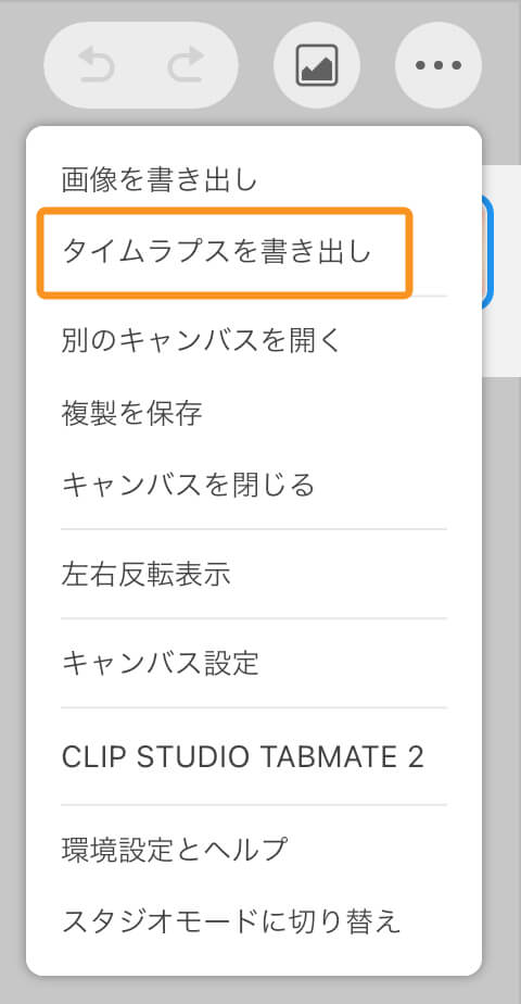 作品が完成したら、右上のメニューボタンを開いて、[タイムラプスを書き出し]を選びます。