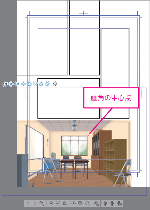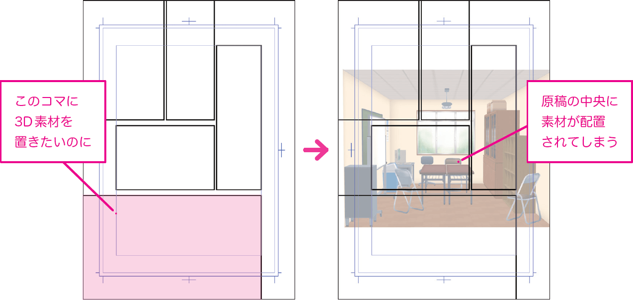 3D素材をそのまま貼り付けて、コマ枠からズレた位置に画角が設定された場合、[レイヤー移動]ツールを使って3Dレイヤーそのものの位置を移動すると、コマと3Dの画角を一致させることができます。