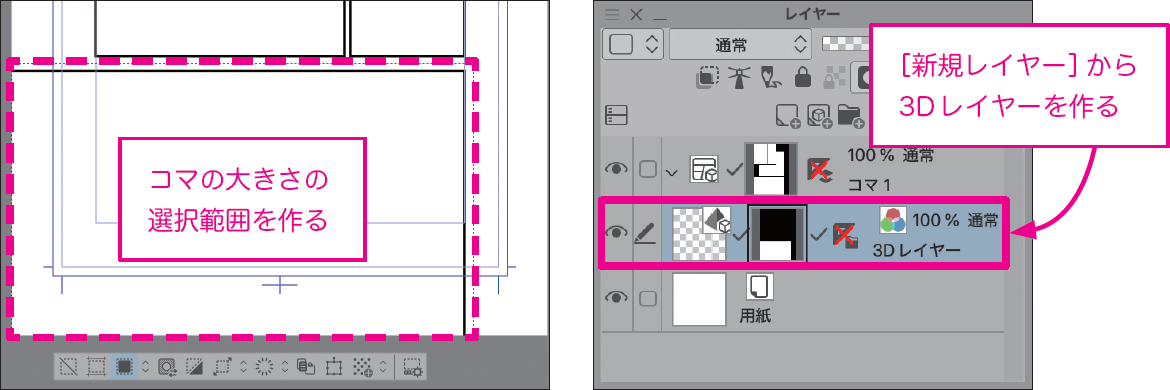 コマに合わせて3D素材を配置したい場合は、コマの大きさ(少し大きいくらいでも操作しやすい)の選択範囲を作成して、メニュー[レイヤー]→[新規レイヤー]→[3D レイヤー]を作成します。
