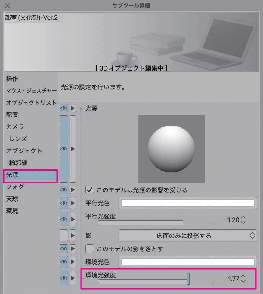 陰影の影響をON のままで室内を明るくしたい場合は、[環境光強度]を調整してみましょう。