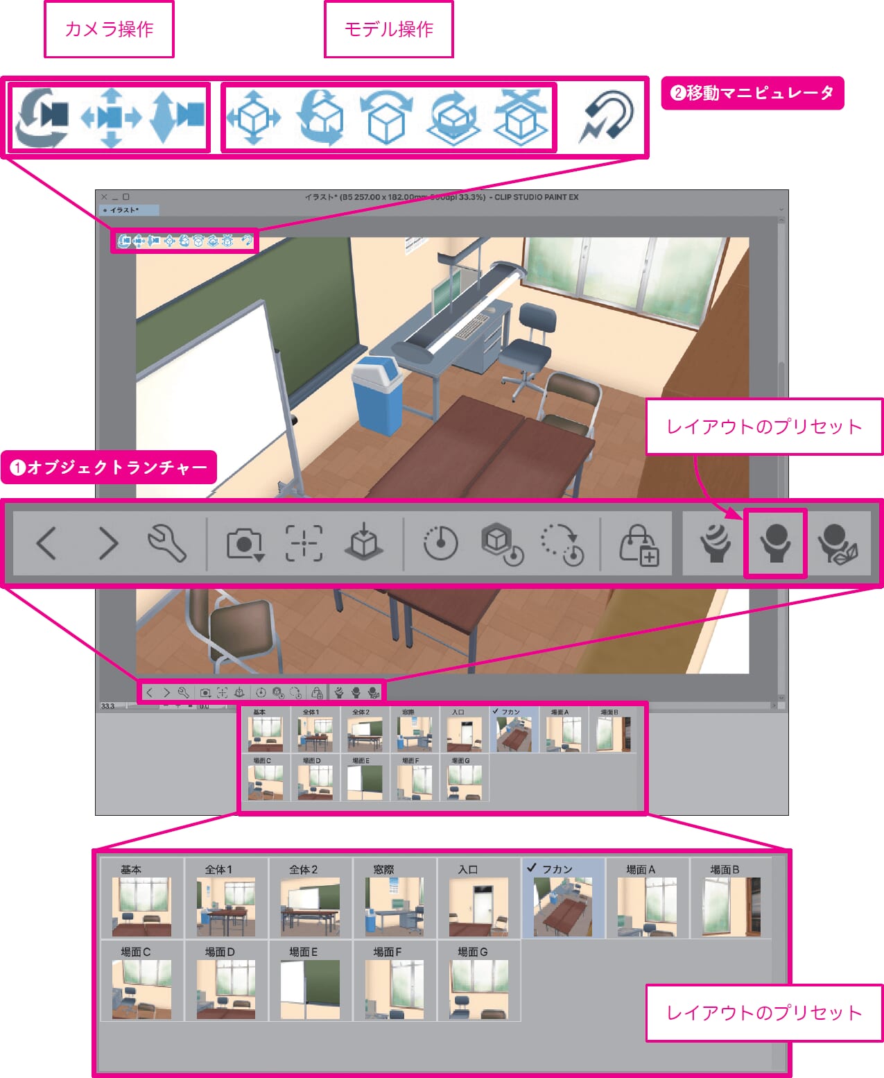 ❶オブジェクトランチャーから[レイアウトのプリセット]を使ってアングルを大まかに決定
