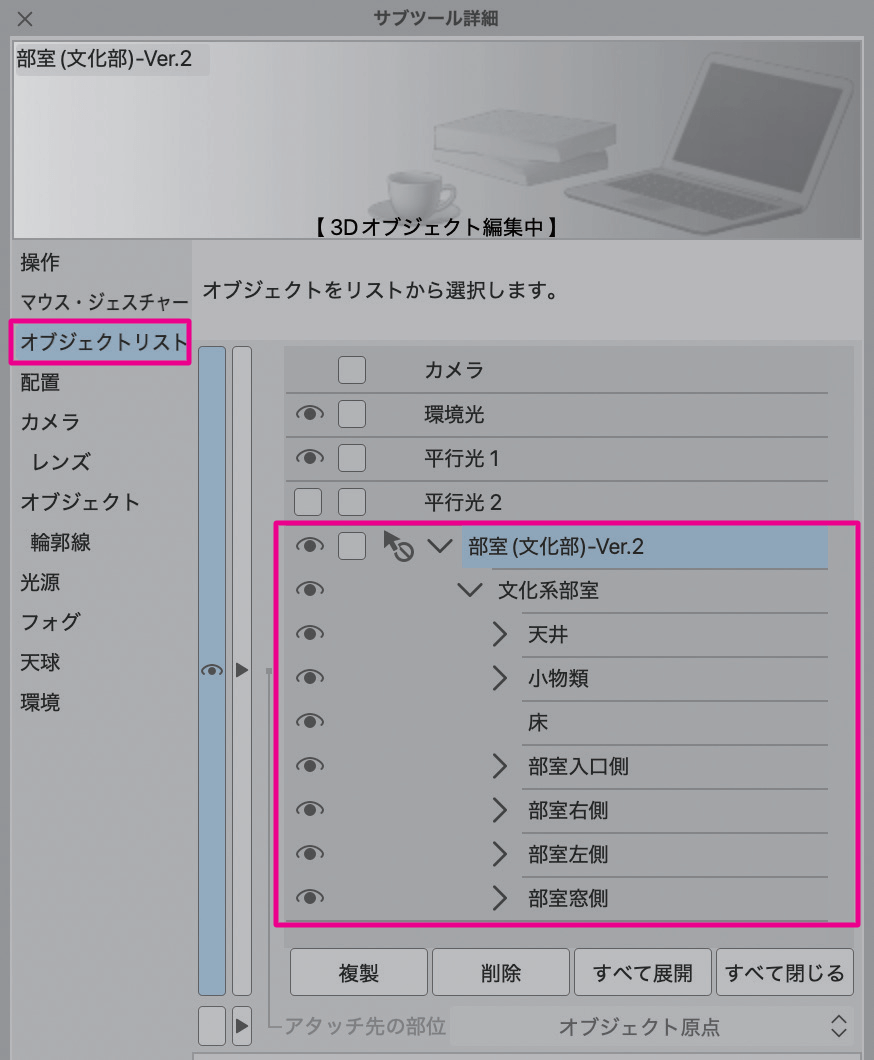 アングルによって邪魔になる壁や家具がある場合は、[オブジェクトリスト]の目のアイコンをクリックして非表示にしてください。