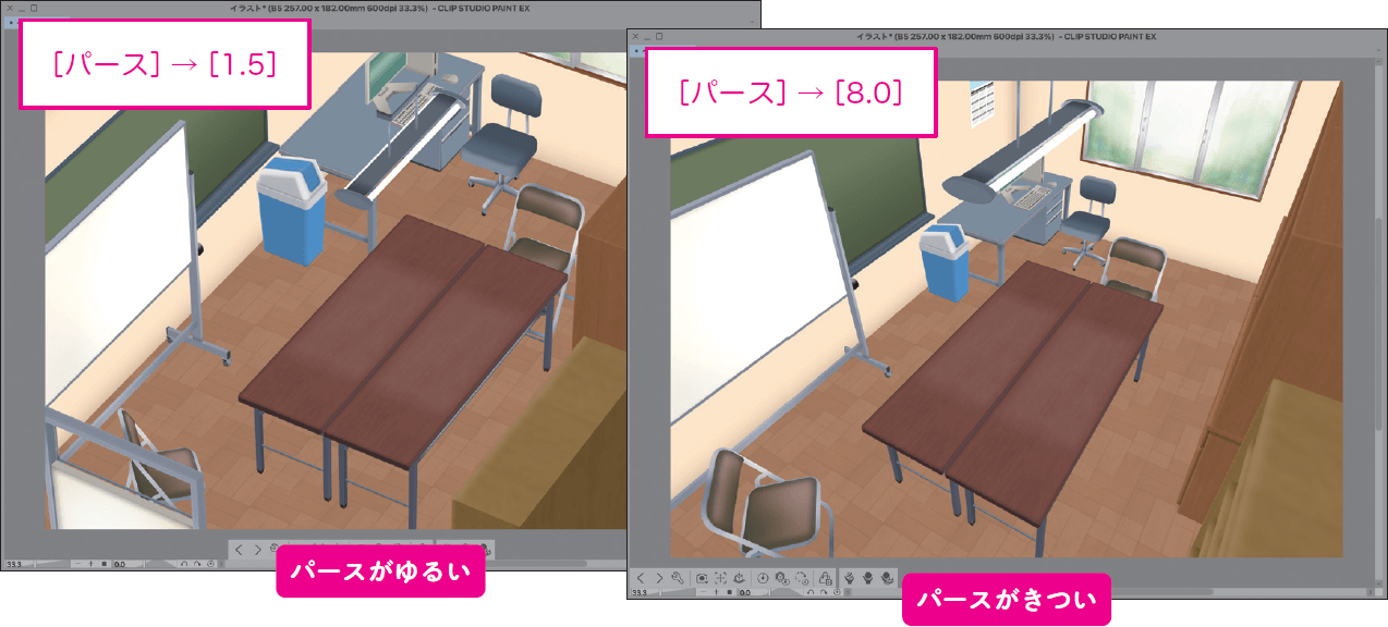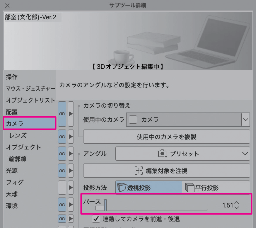 アングルの要素のひとつ、広角/望遠構図(パースの強弱)の切替は[パース]で調整します。