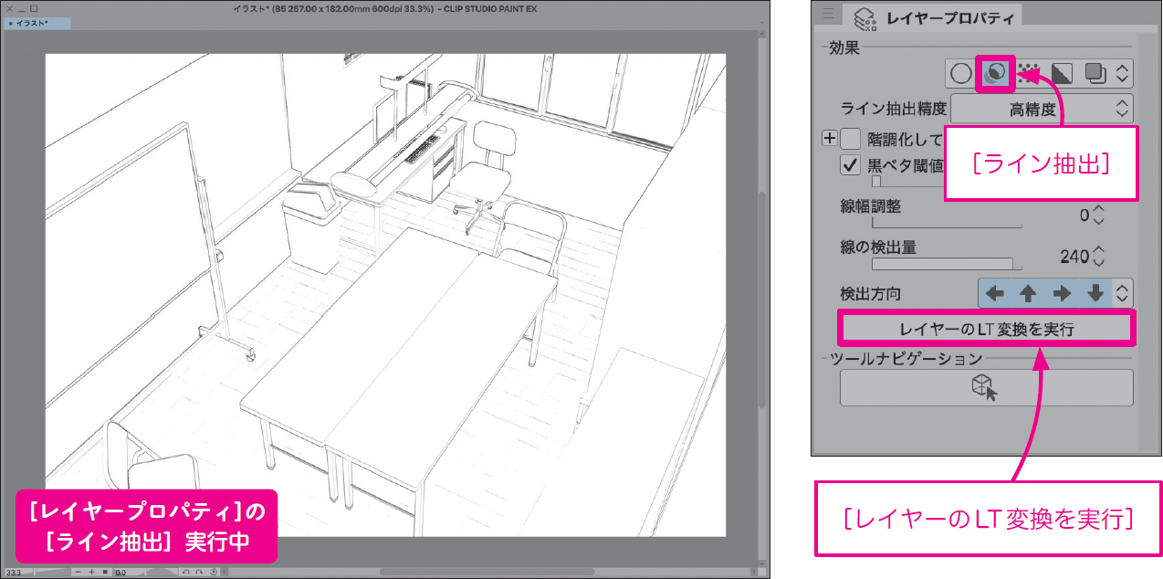 アングルが決まったら[レイヤープロパティ]の[効果]→[ライン抽出]を選択して、表示された[レイヤーのLT 変換を実行]をクリックします。