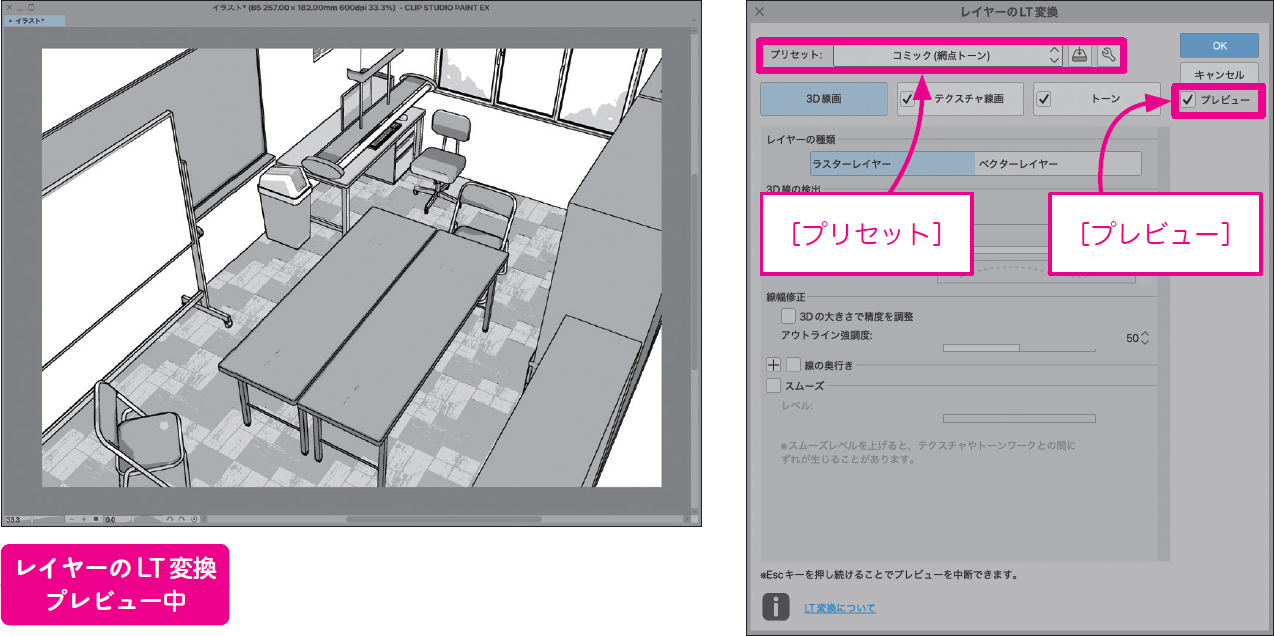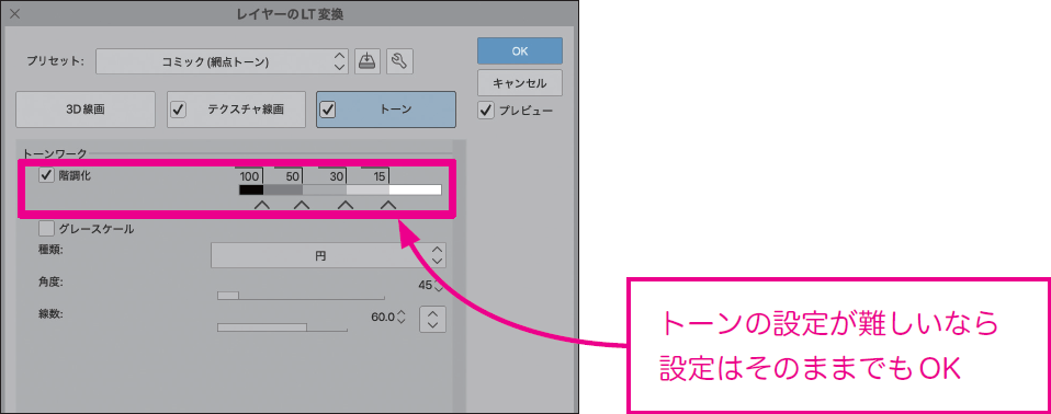 [レイヤーのLT変換]の[プレビュー]をONに設定して、陰影(トーン)の様子などを確認しながら調整します。