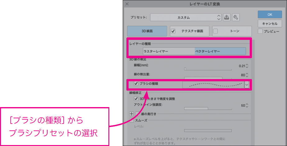 [3D線画]では抽出した線を、ラスター/ベクターレイヤーに書き出すかを選択できます。