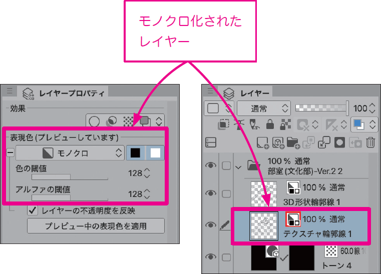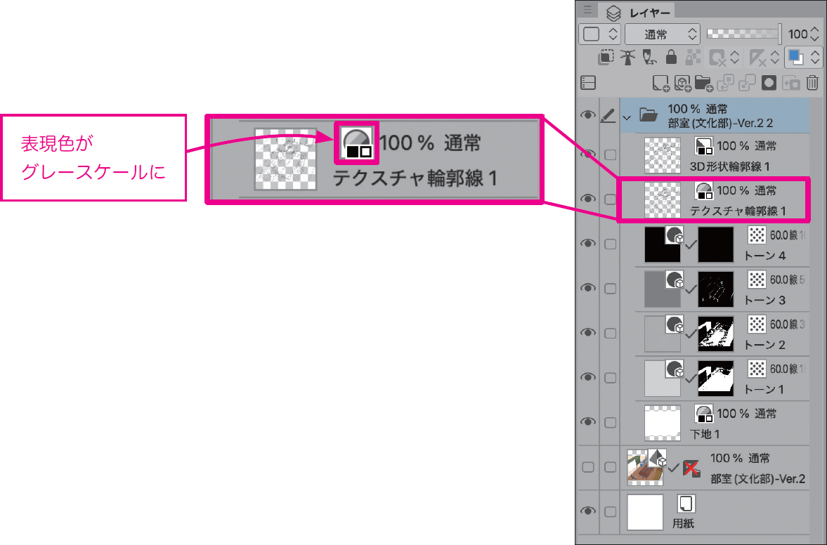 [テクスチャ輪郭線1]レイヤーは、3Dモデル表面のテクスチャ画像が線画化されているものなので、モノクロ化したときに期待した結果にならない可能性もあります。