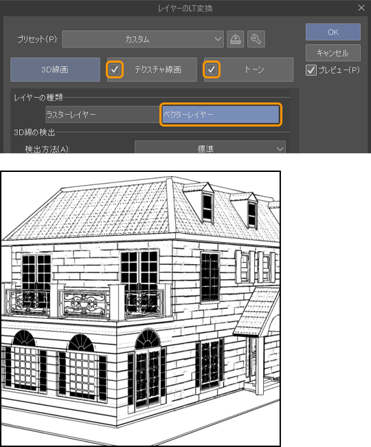 [プレビュー]をオンにして書き出される線画の状態を確認してから[OK]を押します。