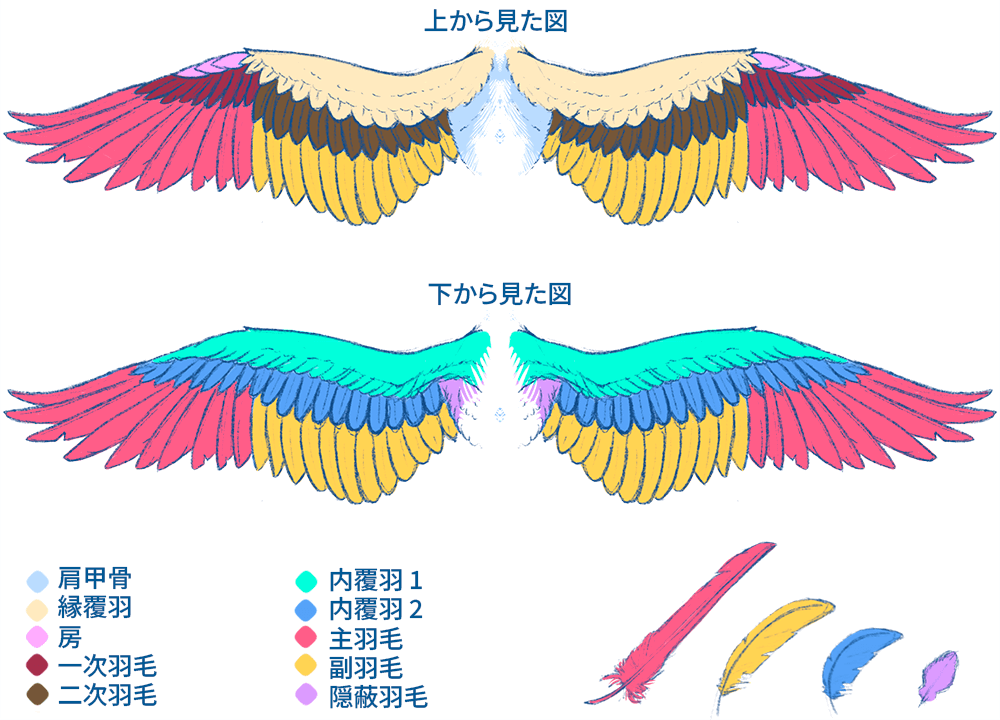 翼がどのように動くかがわかったので、次に翼の各部分の羽毛の種類を区別してみましょう。