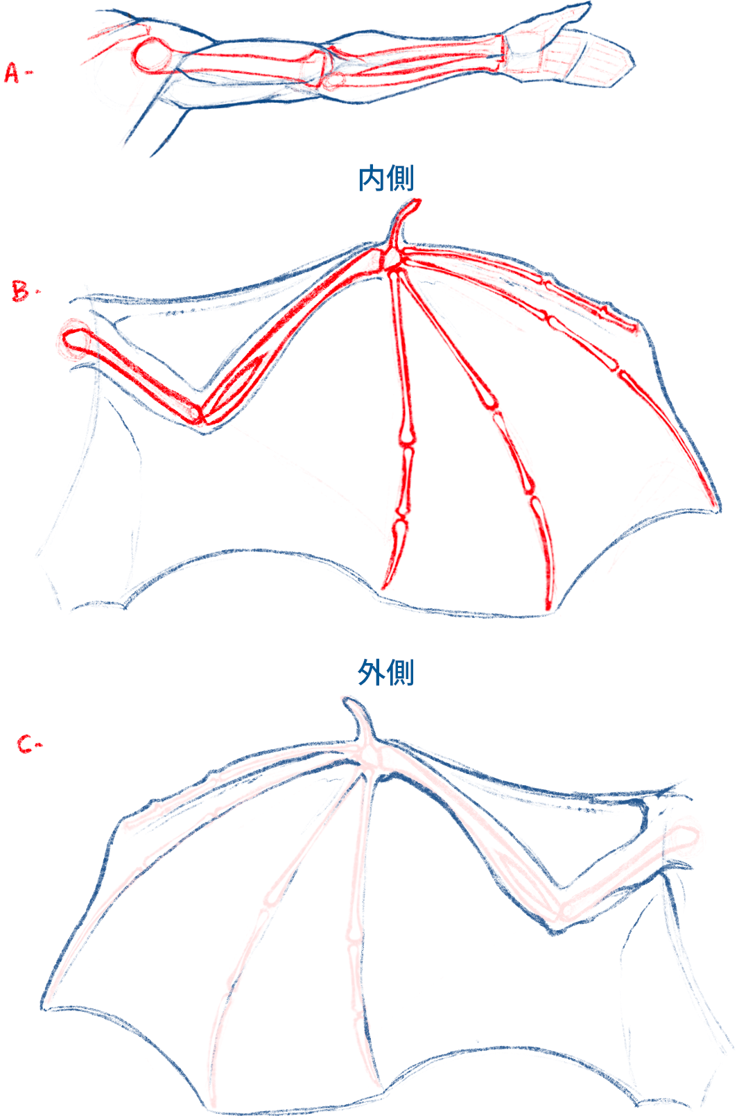 膜状の翼を描く際には、まずは人間の腕を描くことから始めることをおすすめします。筋肉の描き方はデザインによって異なります。