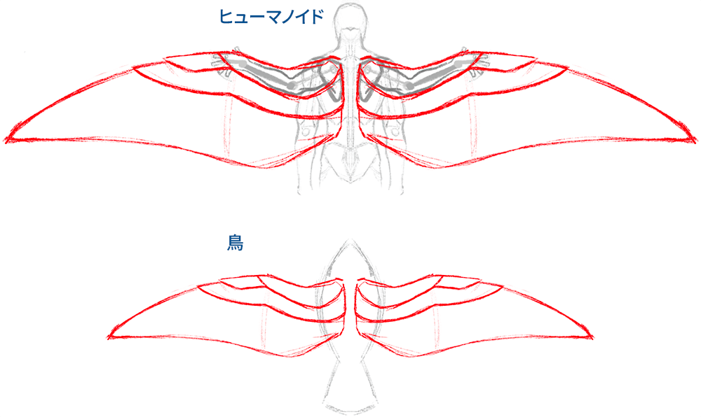 線画を描き始める前に、翼がどのように機能していて、どのような動きをするのか、そしてどのような限界があるのかを明確に理解しておきましょう。そうすることで、翼を描くときに説得力とリアリティーを与えることができます。