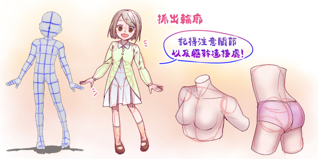 若人體素描的練習不順遂時,使用圓或橢圓來抓出輪廓看看吧!實踐時可以用圓一塊一塊來畫出人體。