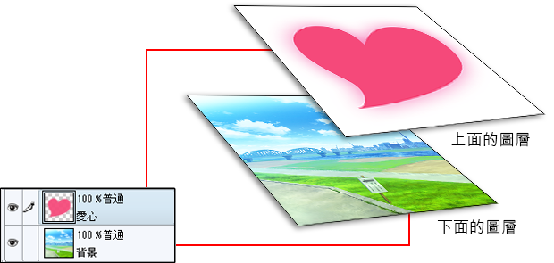 這邊要針對混合模式主要的種類進行介紹。讓我們一起看看變更上方圖層(愛心圖像)的混合模式可以得到什麼樣的效果吧。