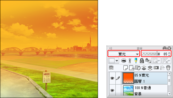 選擇畫有橘色漸層的圖層,將[混合模式]設定為[實光],[不透明度]設定為85%。