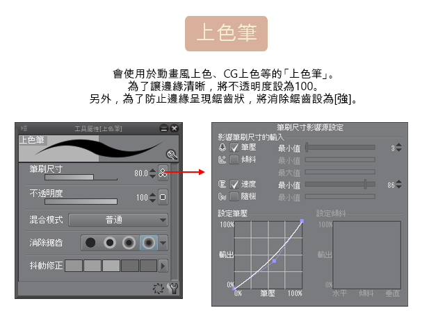 接下來將說明各種上色方式以及塗法的筆刷設定。