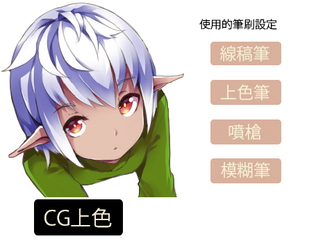 上述CG著色過程使用了「線稿筆」、「上色筆」、「噴槍」、「模糊筆」。