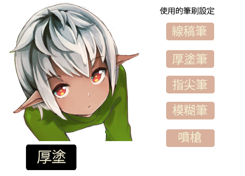 厚塗是多次疊上顏色來營造立體感的塗法,會使用「厚塗筆」、「指尖筆」等筆刷。