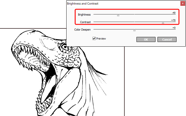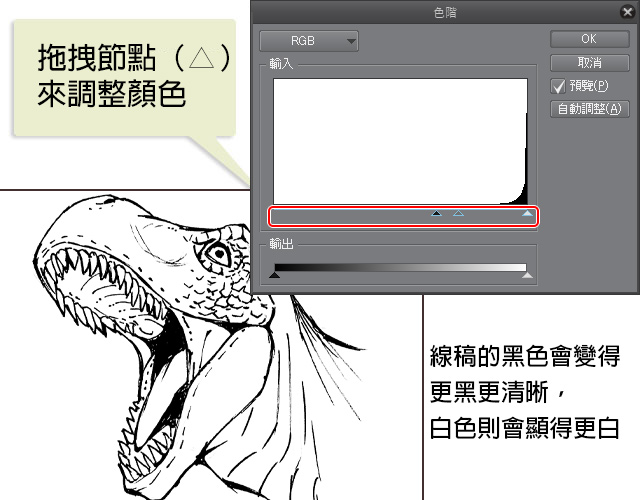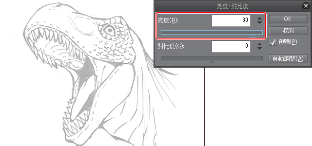 為了讓線條變濃,這次要調整[對比度]的滑桿,並調降[亮度]滑桿的數值,讓線不至於消失不見。