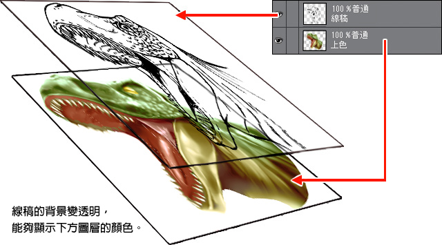 線稿完成之後,就能在線稿圖層下方疊加上色圖層,所以可以在不塗蓋到線條的狀況下進行上色。