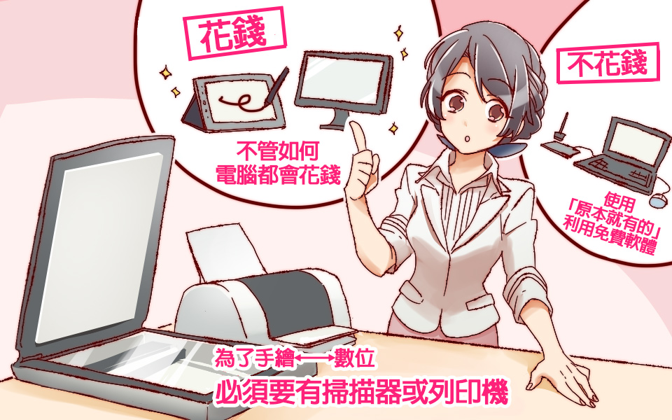 雖然不是必需品,但如果想將傳統手繪的插畫漂亮地讀取至電腦中,推薦使用掃描器。