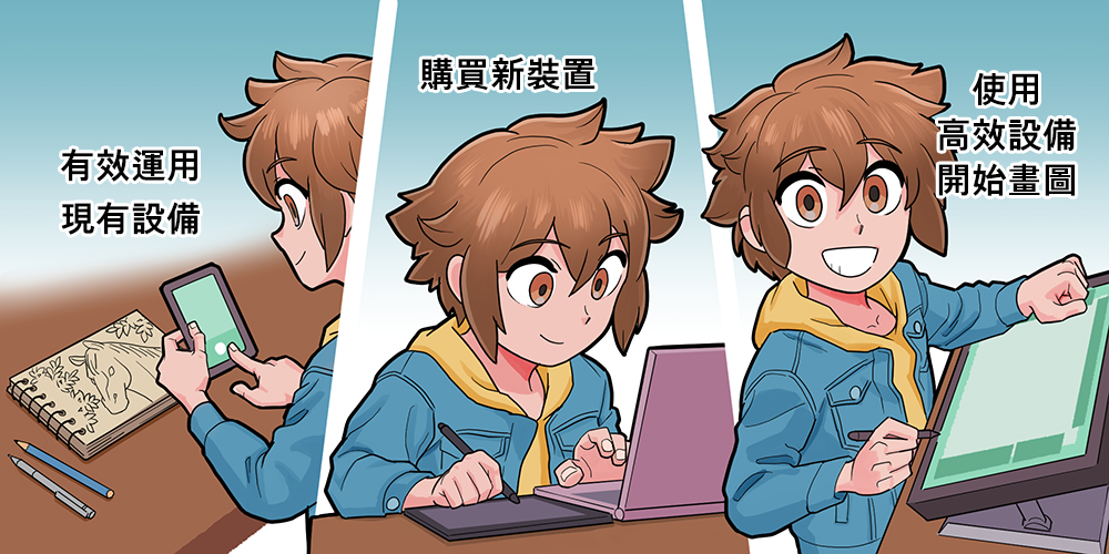 如果一時之間沒有足夠的預算,可以先購買試用於智慧型手機和電腦兩者的繪圖板,連接目前的手機或電腦,並利用免費繪圖軟體或試用版來踏出電繪的第一步。