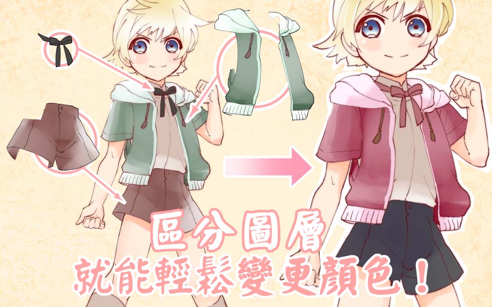 舉例來說,在不同圖層上繪製臉和頭髮,就能夠只重畫頭髮而不動到臉的部分。只想調整衣服顏色的話,操作起來也非常輕鬆。