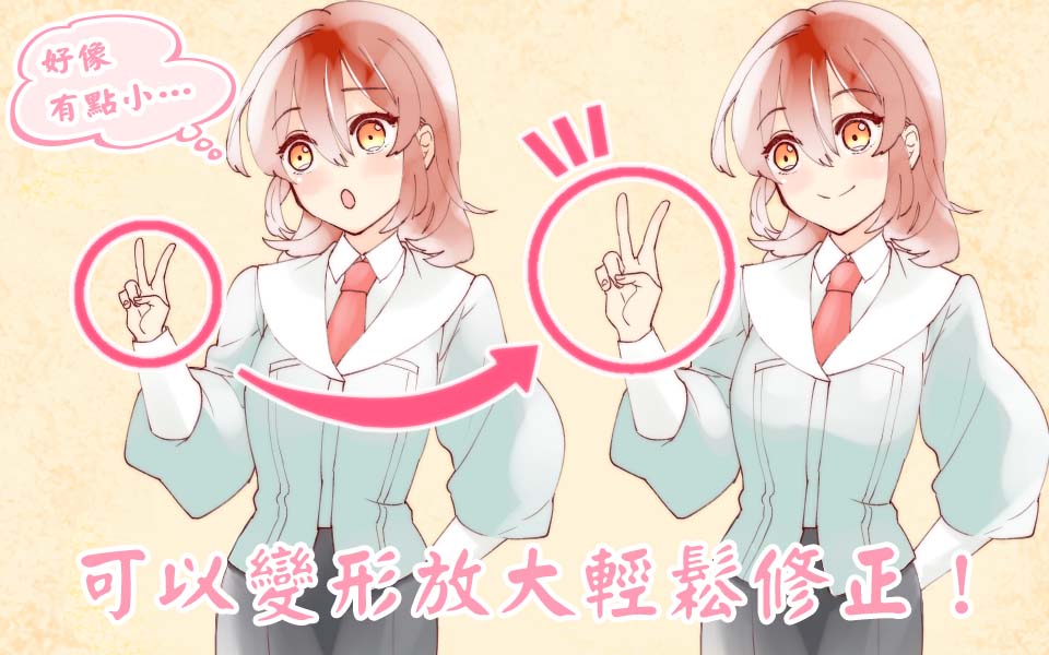 在覺得繪製的角色肢體有點不平衡、想要更改手腳的長度、想把眼睛變大等時候,使用這些功能就能輕鬆進行修正。