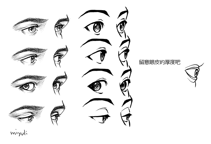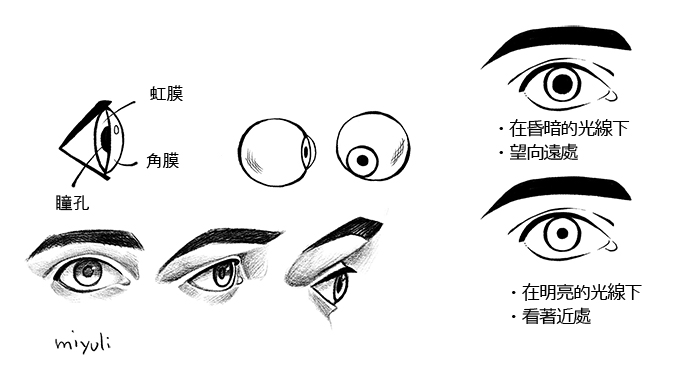 試著畫畫看各式各樣的眼尾、眼睛的形狀、眉毛、睫毛和虹膜吧。