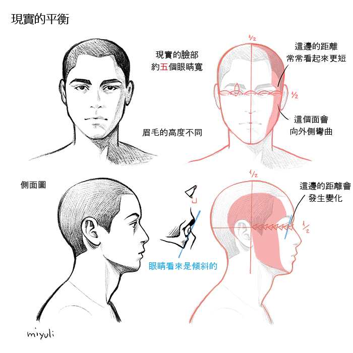 如果是一般成人的臉孔,眼睛的位置大約會在臉部高度的一半。通常瞳孔也在臉部高度的中央。