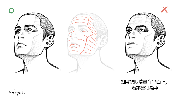 在畫有角度的臉部時,如果把眼睛直直地並排,臉看來就會很平面。因為臉部稍微有點弧度,所以眼睛看來會是斜的。