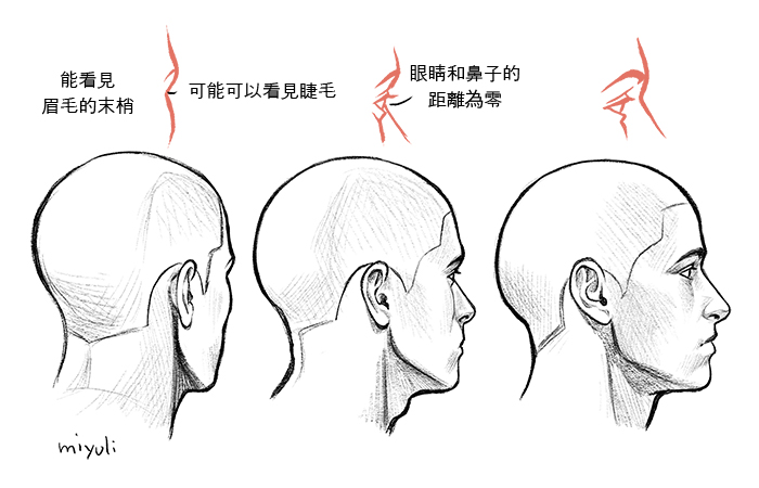 另外,從正側面觀察臉部,眼窩中的眼睛看來會稍微下傾。