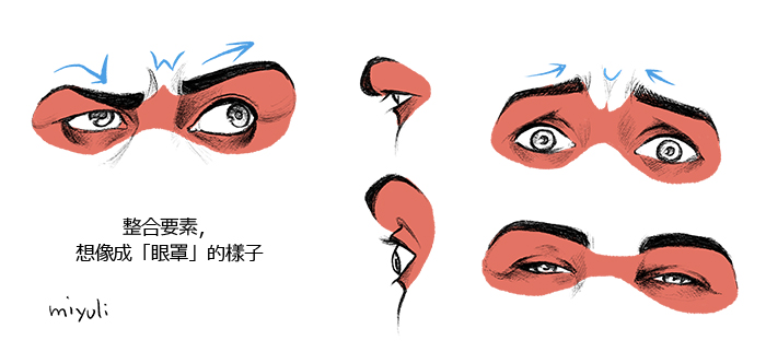 把它當成眼罩,就可以輕鬆地想像出各種角度,能把眼睛周圍的要素當成一個整體來思考,而非分散的元件。