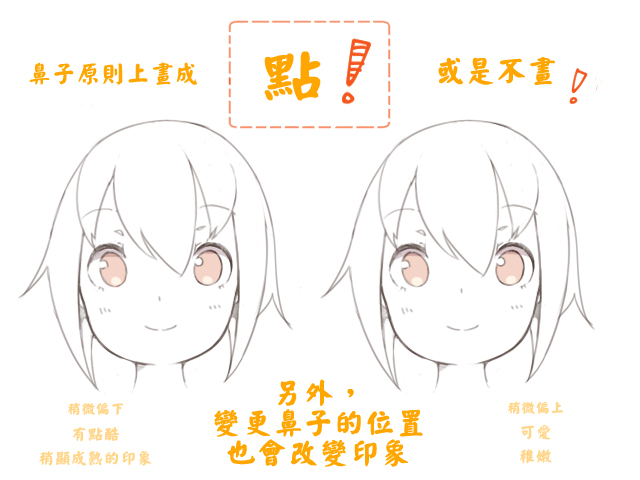 我想大部分的人應該都很清楚,「鼻子畫成點,或是不畫」最能夠帶出可愛感。