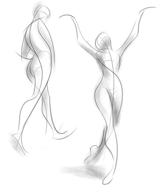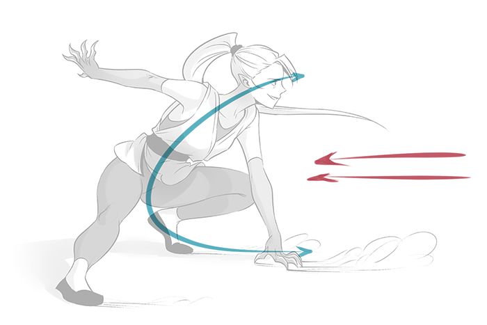 即使你的繪圖風格不走寫實路線,還是可以用某些不會改變的要素畫出有趣又明確的姿勢, 包括:強度和節奏、動態線(運動線)、構築、透視。