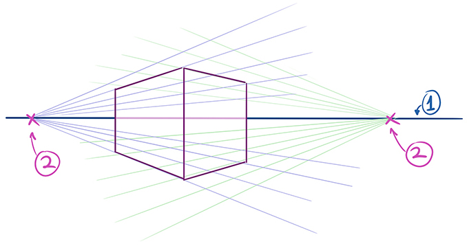 (1)表示的是人物實際的眼睛高度或水平線,(2)則是收斂在水平線上的消失點。下圖是畫了具有兩個消失點的透視物體,可以看見物體的兩個面。