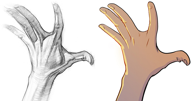 漫畫手的輪廓和真實的手非常接近,但它的陰影會稍微平坦一些。我找出一張以前畫過的手,試著把它變成了漫畫風格。