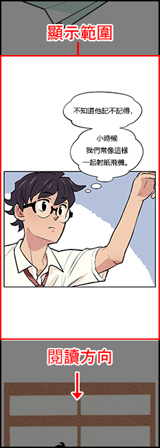 為了讓圖像完整顯示在螢幕範圍內,Webtoon的分鏡以垂直方向一格一格配置,只需要縱向捲動卷軸就能夠閱讀。