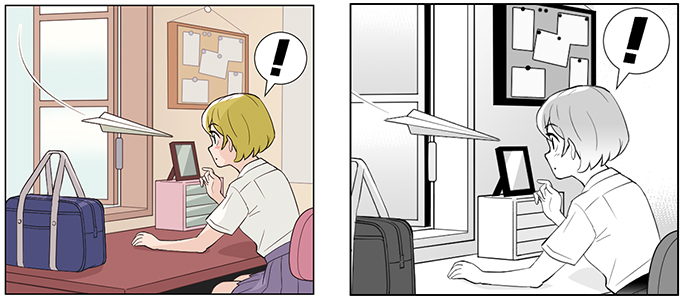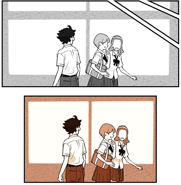 黑白漫畫會以網點或塗黑來表現心情或時間的流逝,Webtoon則以顏色進行呈現,和彩色漫畫相同。