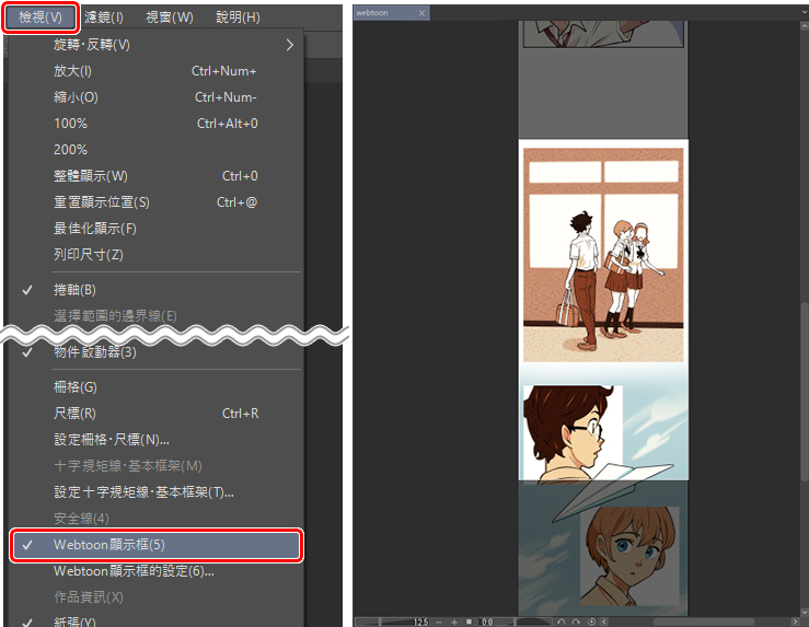將[檢視]選單→[Webtoon顯示框]設為開啟,就可以確認在智慧型手機畫面比例上的畫布顯示狀態。