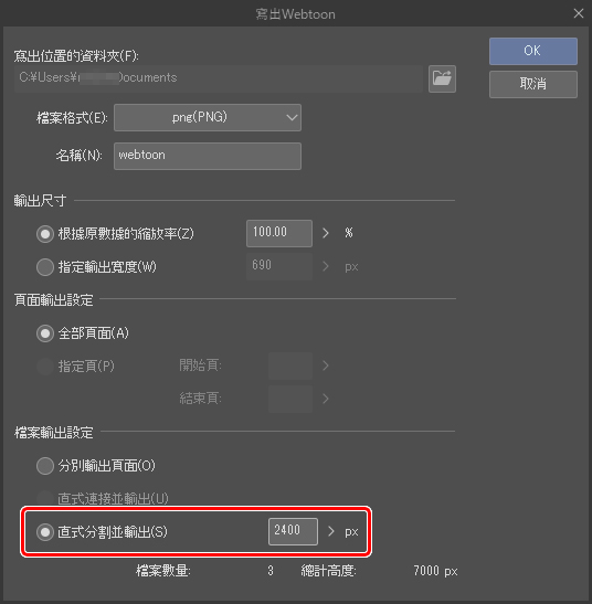 Webtoon用的分割寫出可以在[檔案]選單→[寫出Webtoon]中進行設定。
